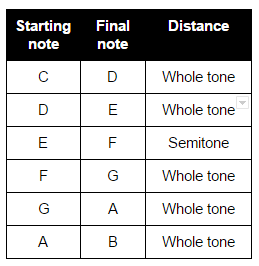 Each of those notes will have a certain frequency of sound, which means that we can define a distance between each note. We will call these distances whole tone and semitone, in which two semi tones are equal to a whole tone.