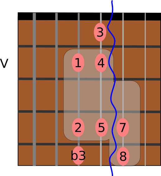 The interesting thing about this pattern is that it can be moved anywhere on the fretboard, with the root notes in any string. You can even use it backwards, that is consider the octave note as the root note and find the same intervals.