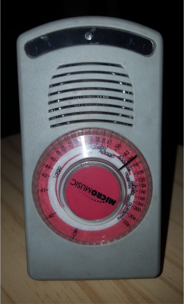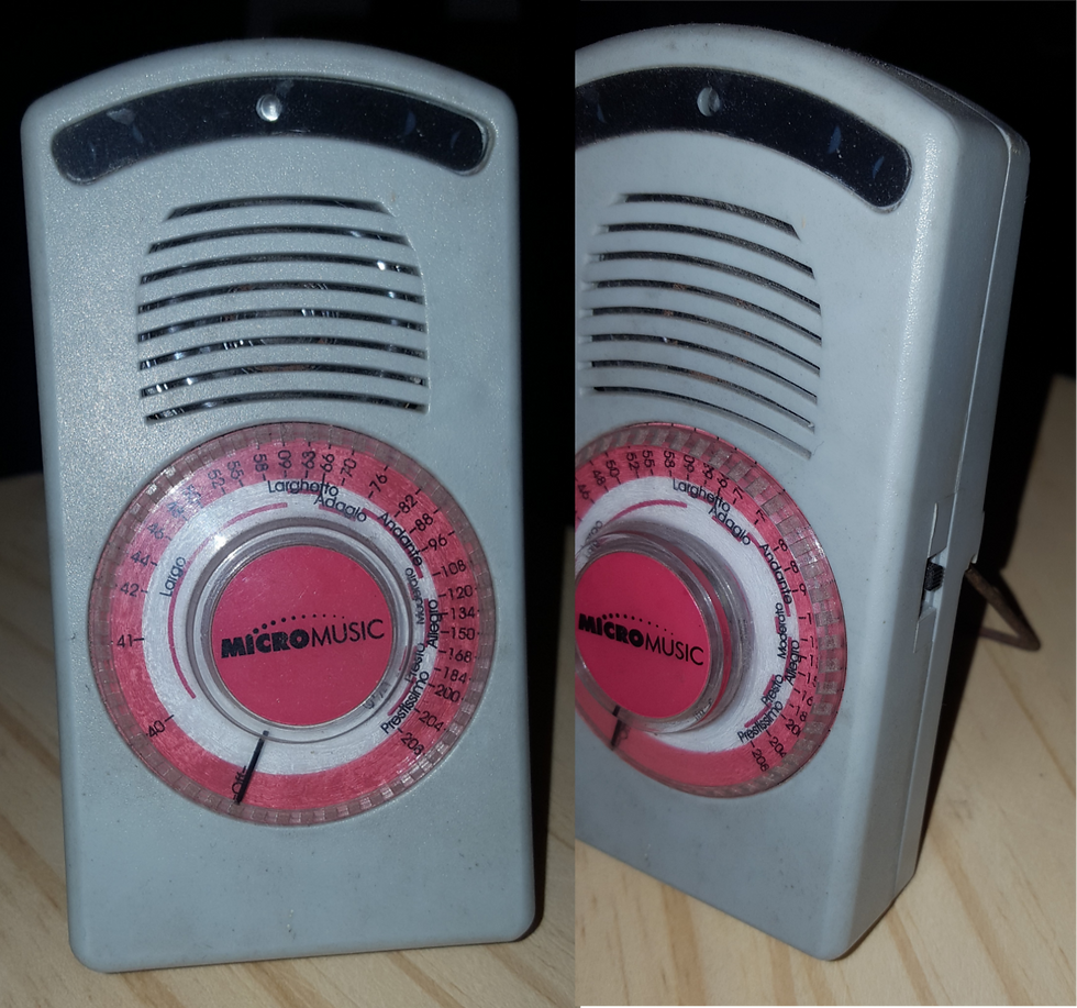 This one is a simple metronome that runs on a 9V battery. A simple dial sets the device off when taking it counter-clockwise, and if you rotate it clockwise you can get the BPM you want by moving the black indicator line on top of the scale. On its right side, there is a small switch that activates/deactivates the ticking sound; the metronome already flashes a red led on the top on each beat. I never used it without the the sound, and I don't know why the manufacturer chose to include that feature, but there it is.